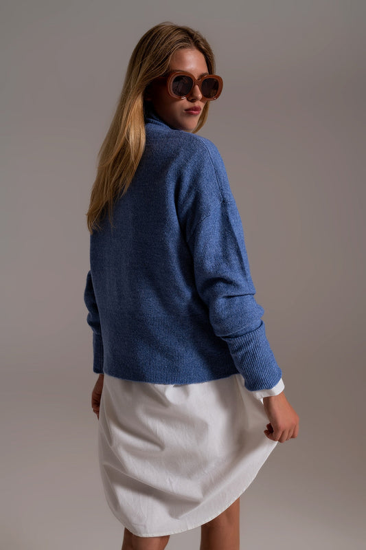 suéter de punto con punto musgo y mangas contrastantes en azul