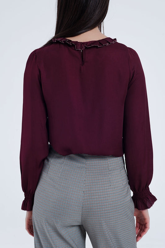 Top con detalle de cuello subido con volantes en granate