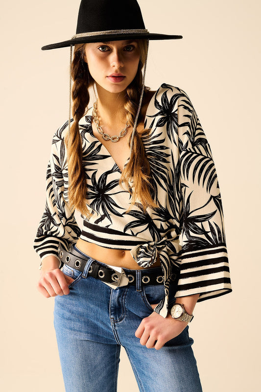 Top corto en color Beige con cuello en V manga corta y detalle de flores en el cuello
