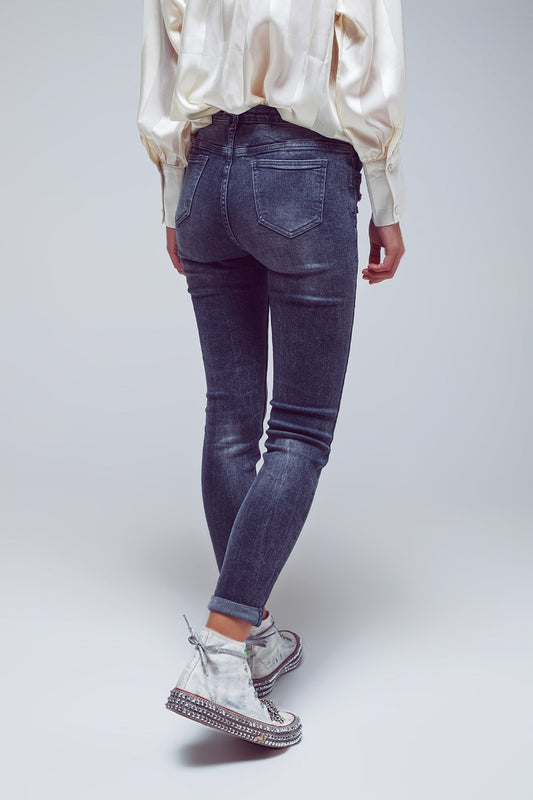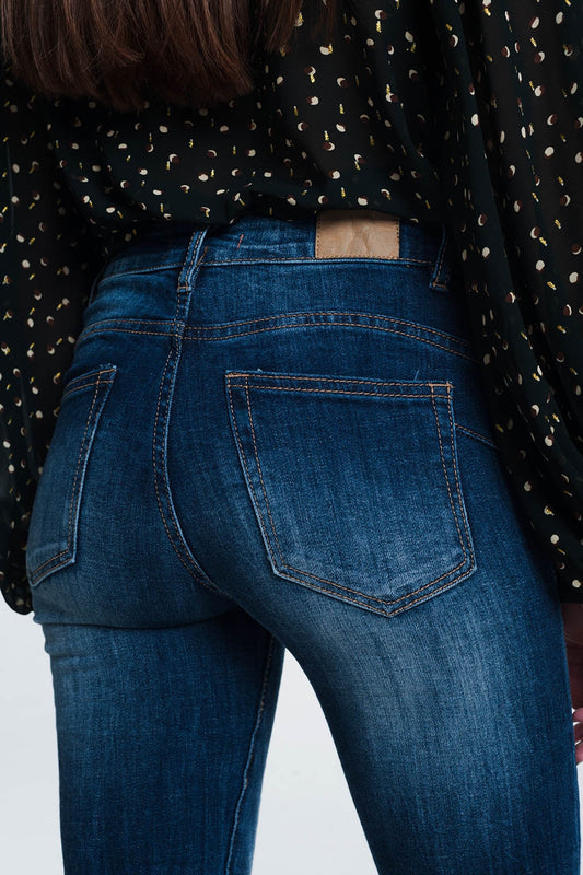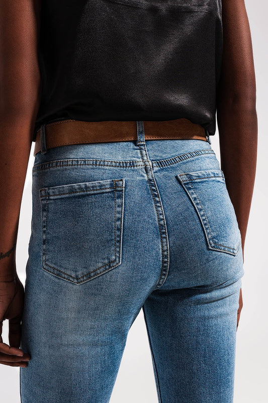 Vaqueros ajustados lavado azul con flecos en el bajo