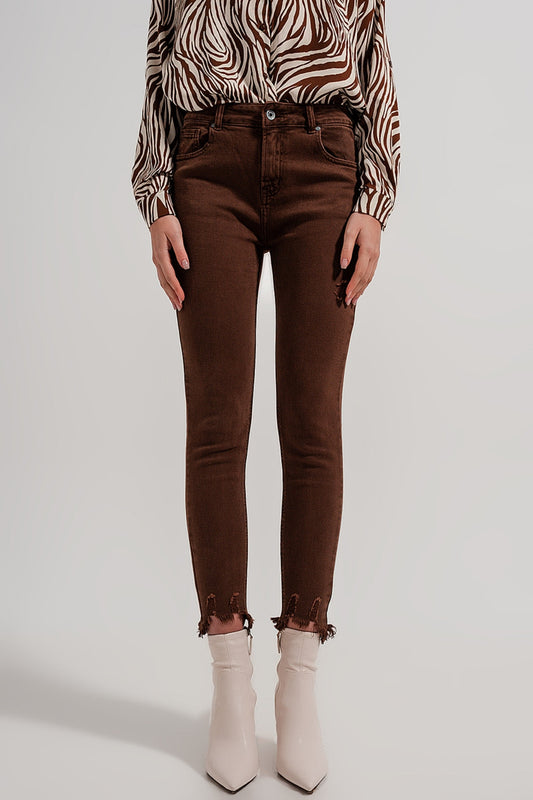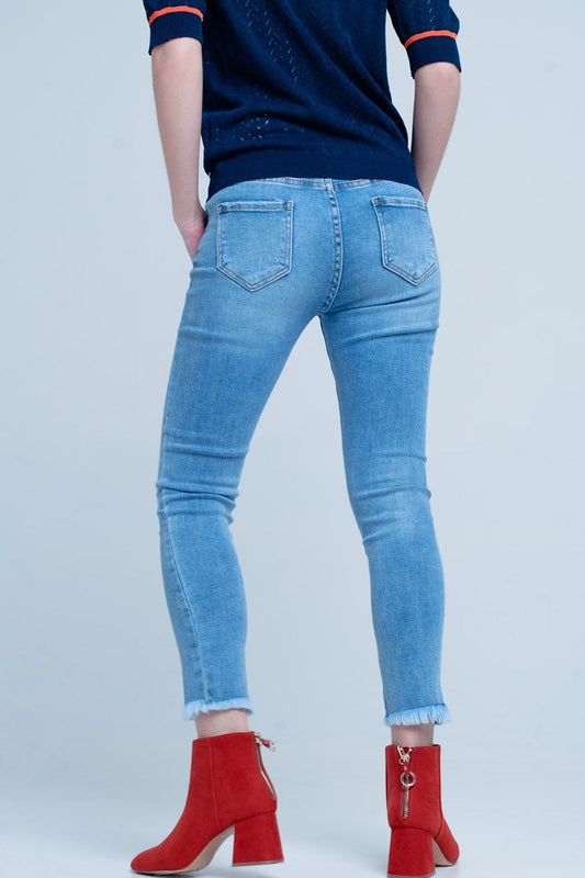 Vaqueros ajustados en azul claro con bajos deshilachados