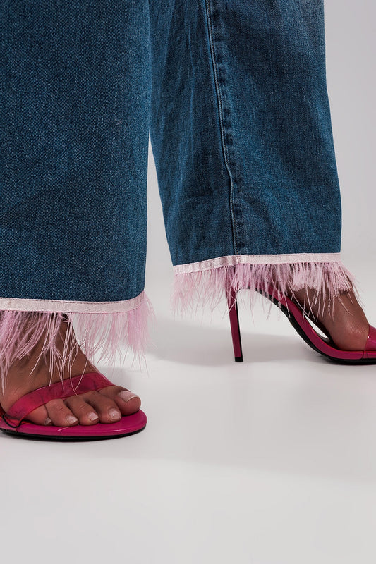 Vaqueros de pernera recta con plumas sintéticas en el bajo de color ROSA