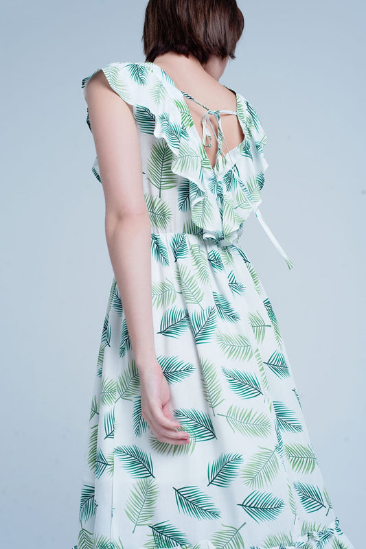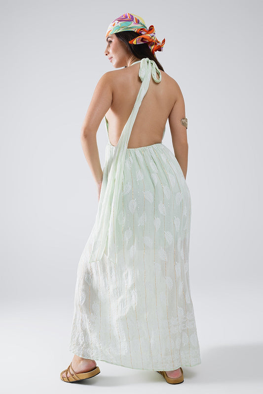 Vestido Midi Halter con estampado de hojas color menta y detalles de lúrex