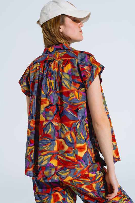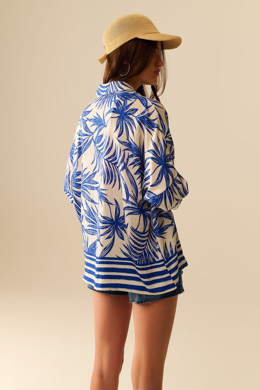Blusa Relajada con Motivo Tropical en Azul y Blanco