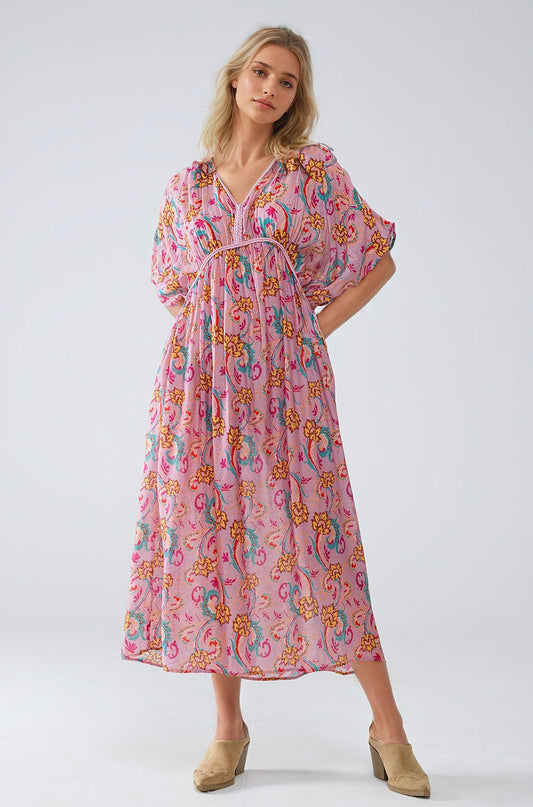 Maxivestido rosa con costuras trenzadas y estampado de flores