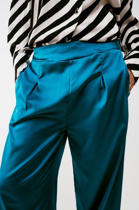 Pantalones blancos de raso con bolsillos laterales y aros para el cinturón