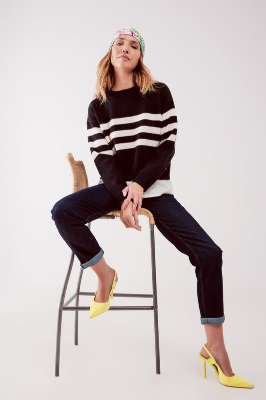 2 en 1 Sueter negro de rayas con capa inferior de camisa