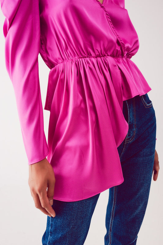 Blusa asimétrica con mangas abullonadas en fucsia