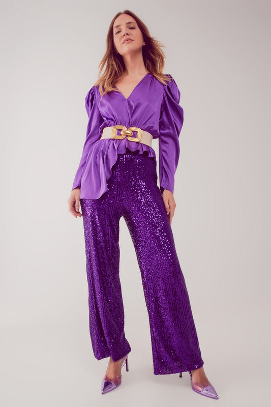 Blusa asimétrica con mangas abullonadas en morado