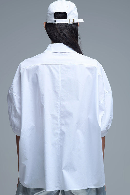 Camisa relajada de popelina de manga 3/4 con detalle de botones en blanco