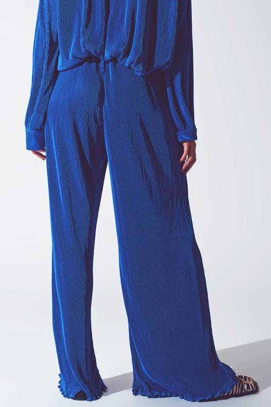 Pantalón ancho plisado de satén azul