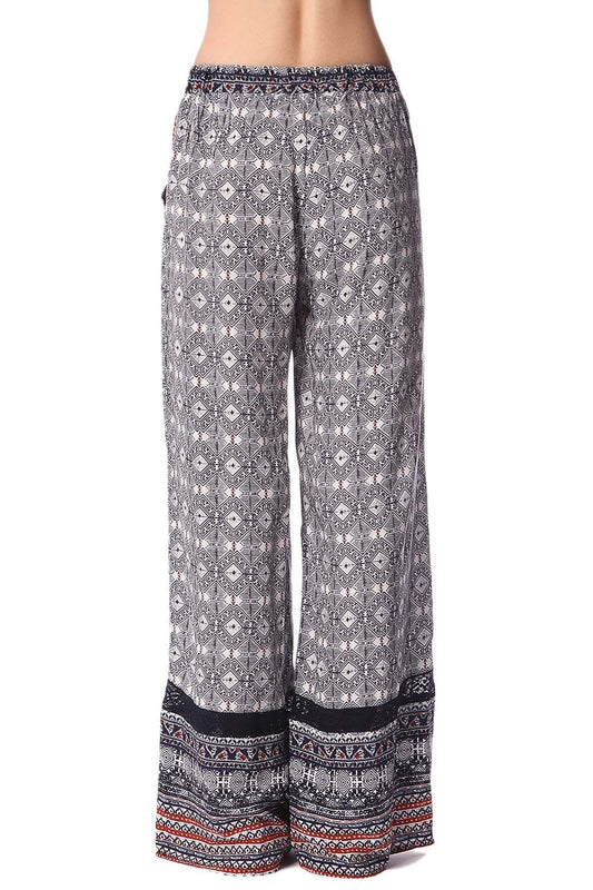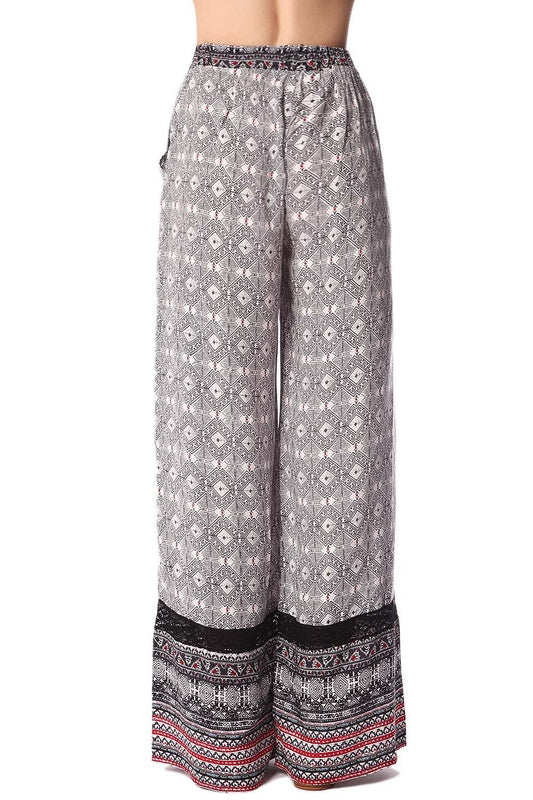 Pantalones de pernera amplia con estampado etnico negro y detalle de puntilla